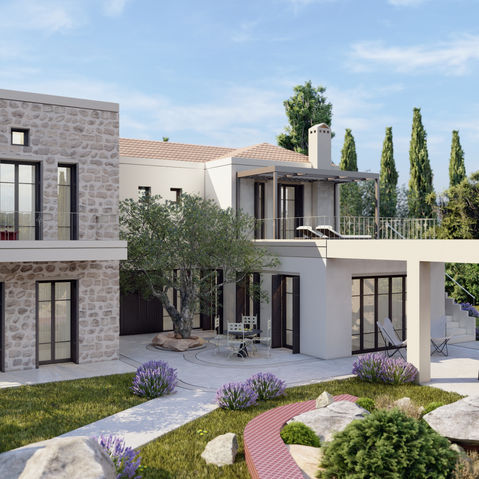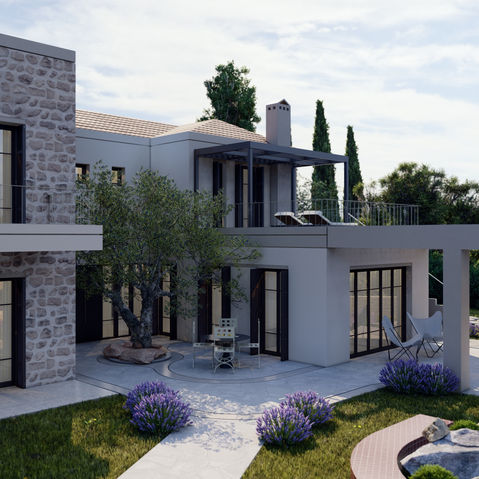 Architectural study for a private residence in the village of Tsoukalades, Lefkas, exploring contemporary custom design solutions that respond to the site and create a harmonious living environment.