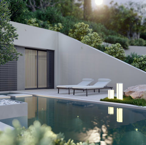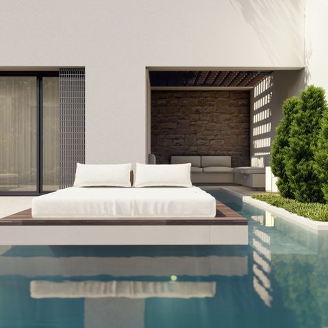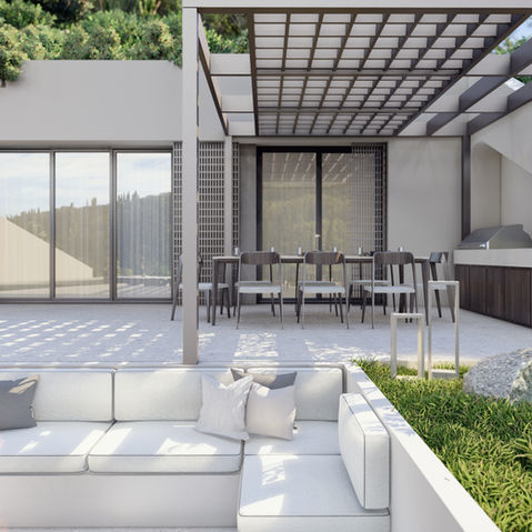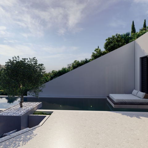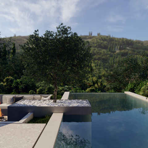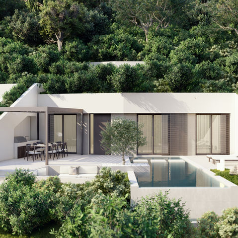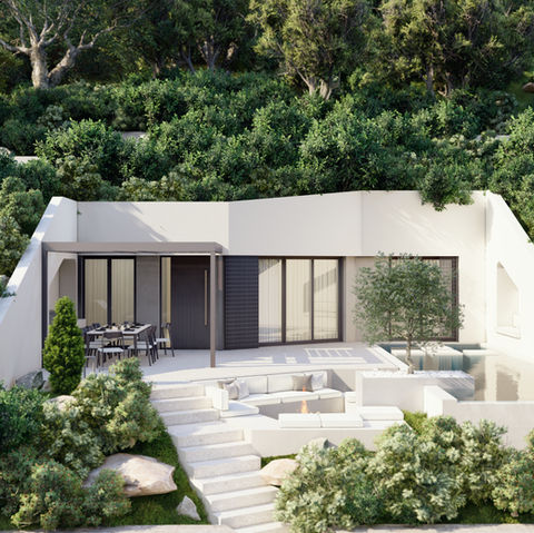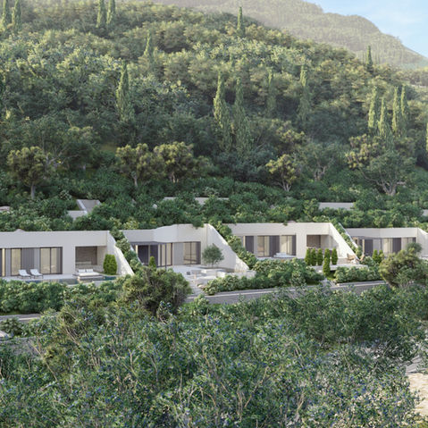 Architectural study for a complex of five cave houses embedded in the natural terrain, exploring the dialogue between architecture, landscape and natural light.